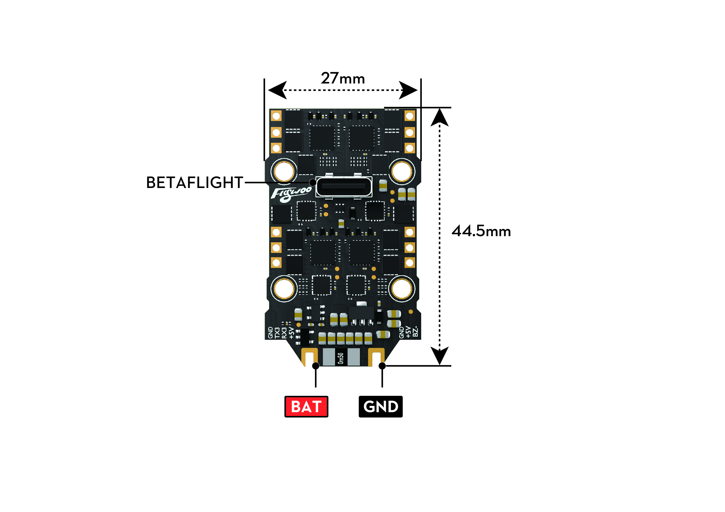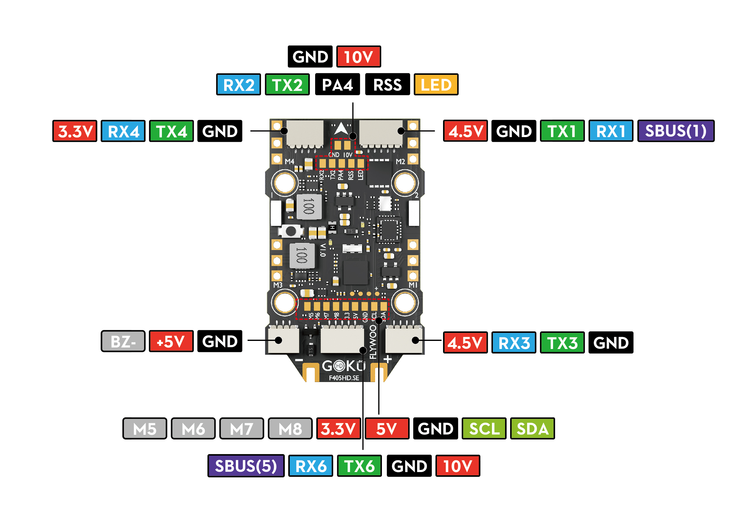 Pinout diagram and component layout of the Flight Controller. (Click image to enlarge)