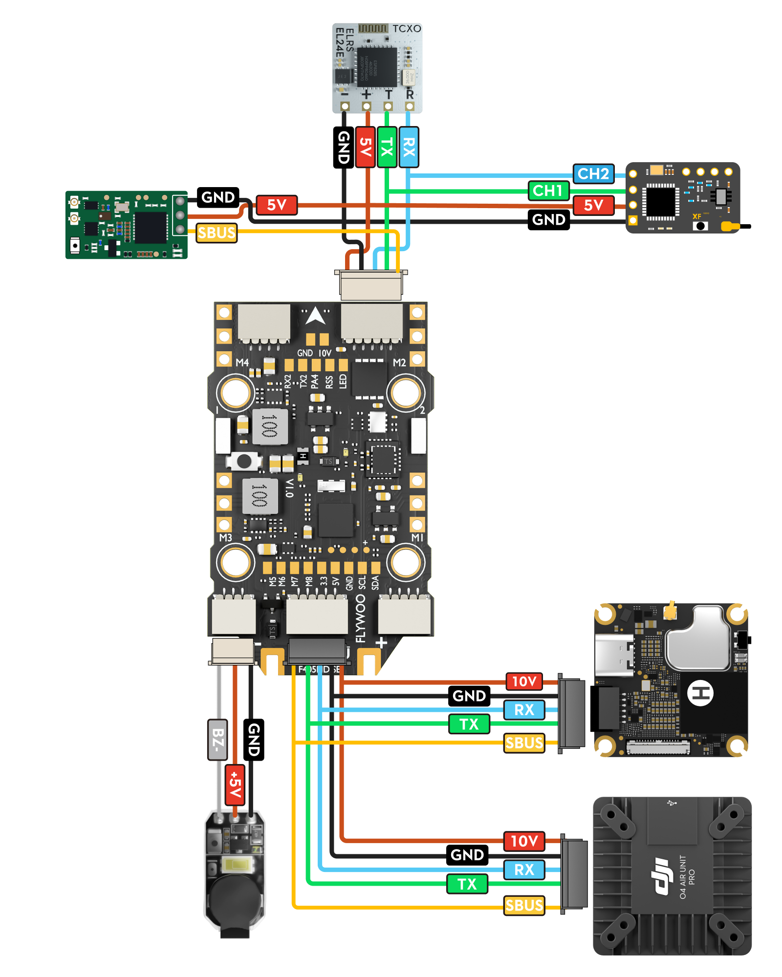 Please refer to the layout image above for pinouts. Ensure correct polarity when connecting the Receiver, GPS, and HD VTX.