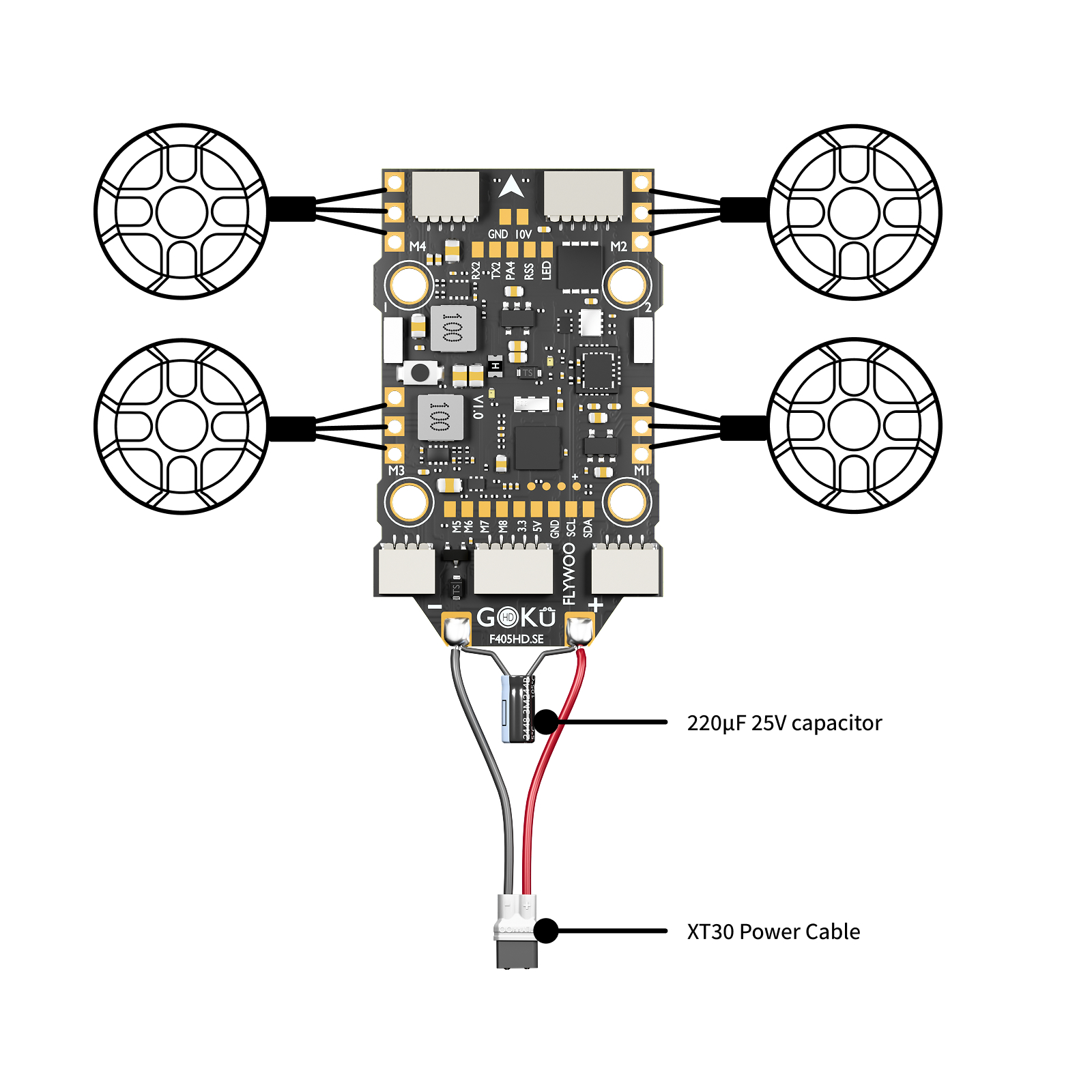 请将四个电机的线材分别焊接至飞控四个角的 M1, M2, M3, M4 焊盘上。焊接时请注意锡点饱满,且相邻焊盘之间绝不能连锡。