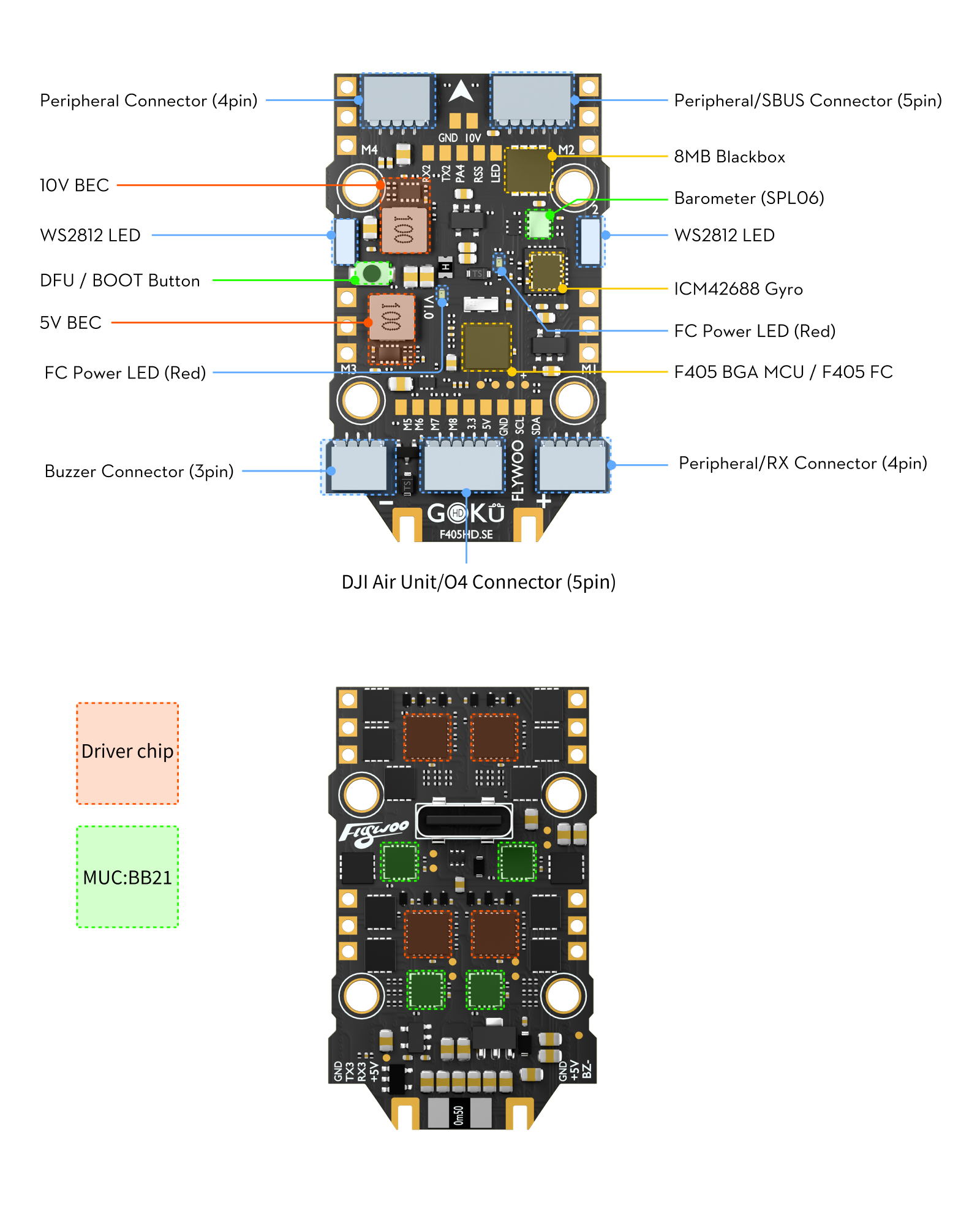 飞控接口定义图与元器件布局说明。(点击图片可放大查看)