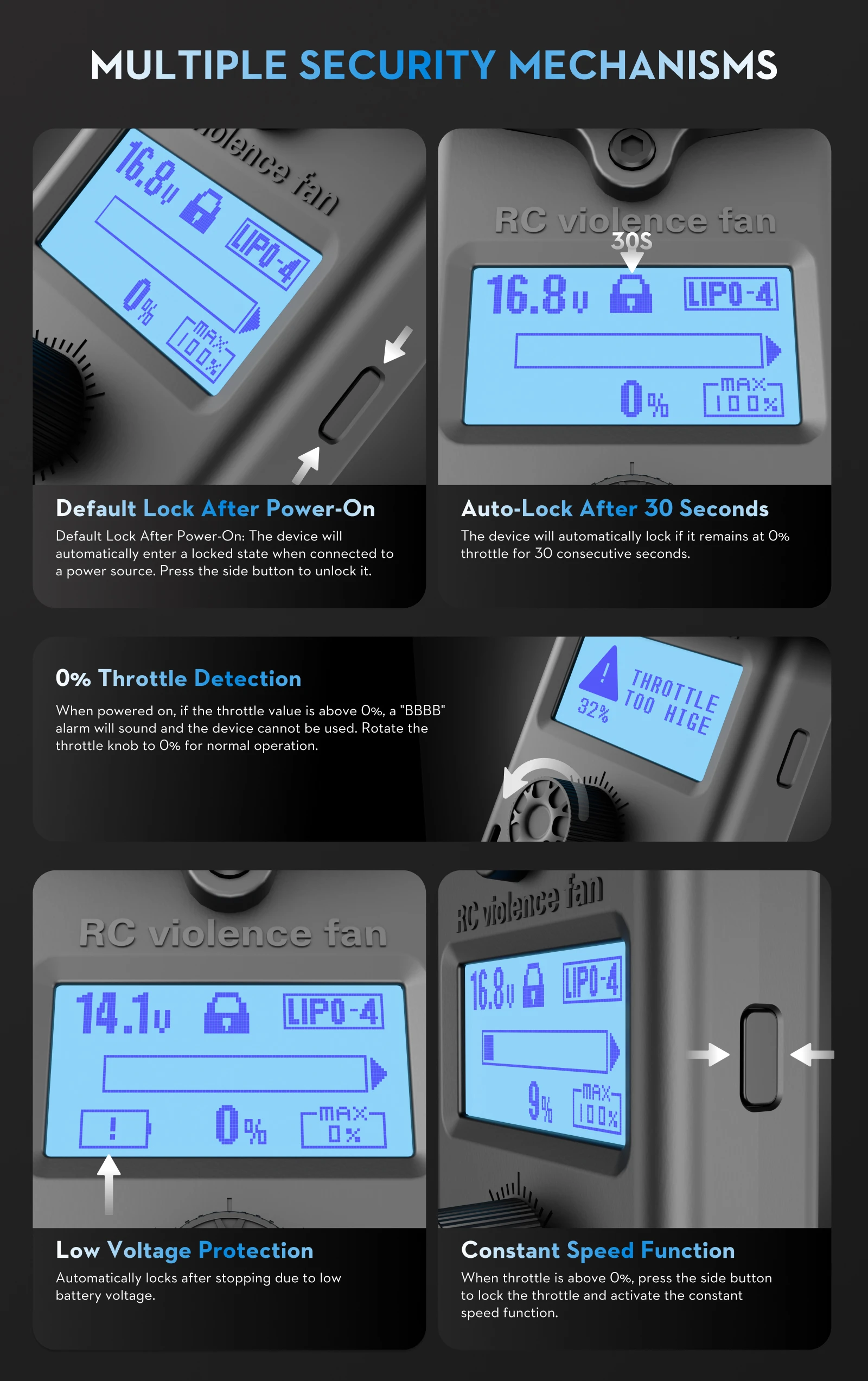 Factory default setting LIPO AUTO(it is alarm that the voltage value reaching 3.4V of the single cells), users canSet as alarm voltage (based on the actual number of battery cells,Setting alarm voltage).